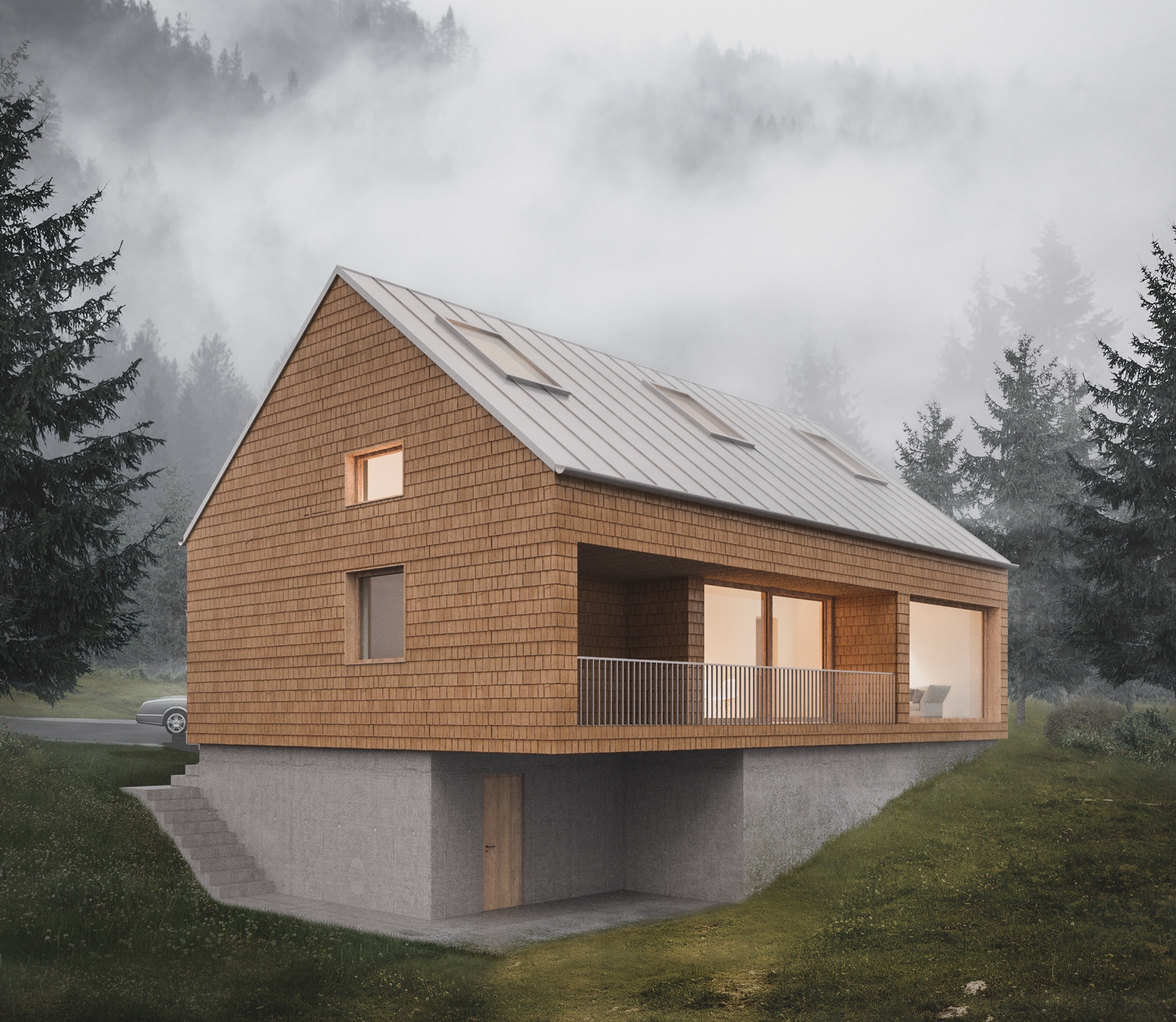 Von der Zufahrt aus betrachtet wirkt der archetypische Grundkörper in Kombination mit einer traditionellen Schindelfassade auf den ersten Blick unscheinbar. Lediglich der geringe Dachüberstand und die sich um den Sockel ziehende Betontreppe weichen vom prägenden Ortsbild ab. Auf der Hangseite erschließt ein separater Zugang das Untergeschoss. Dort befinden sich neben der Haustechnik ein Gästezimmer und zwei weitere Räume. Diese lassen Spielraum für zukünftige Ausbauten und könnten bei Bedarf über die Speis mit dem Obergeschoss verbunden werden. Solche Merkmale zeigen das Bestreben von Studio JL, dass sich ihre Gebäude mit den Jahren an die Bedürfnisse zukünftiger Bewohner anpassen, und je nach Lebenssituation weiterentwickeln können müssen.