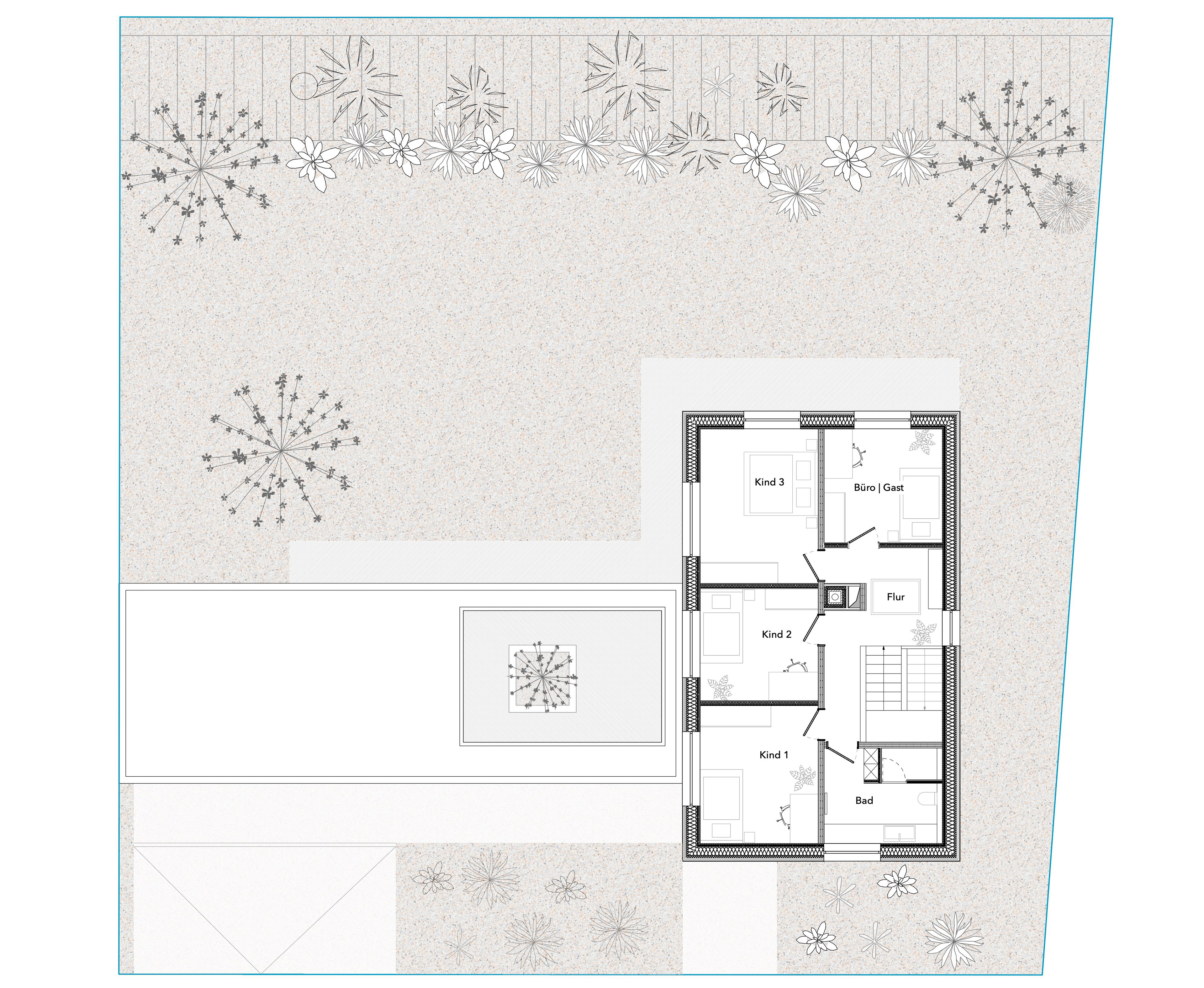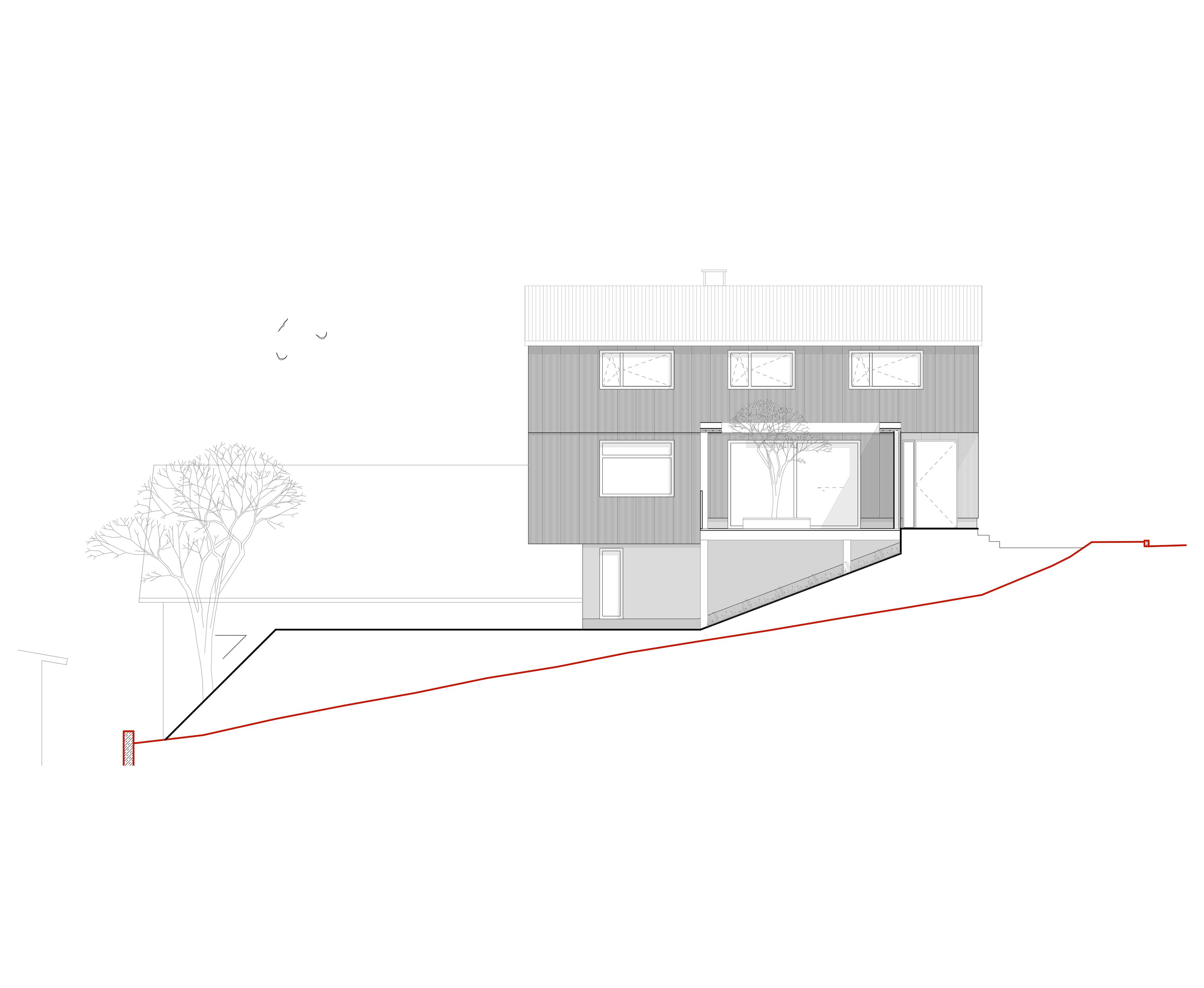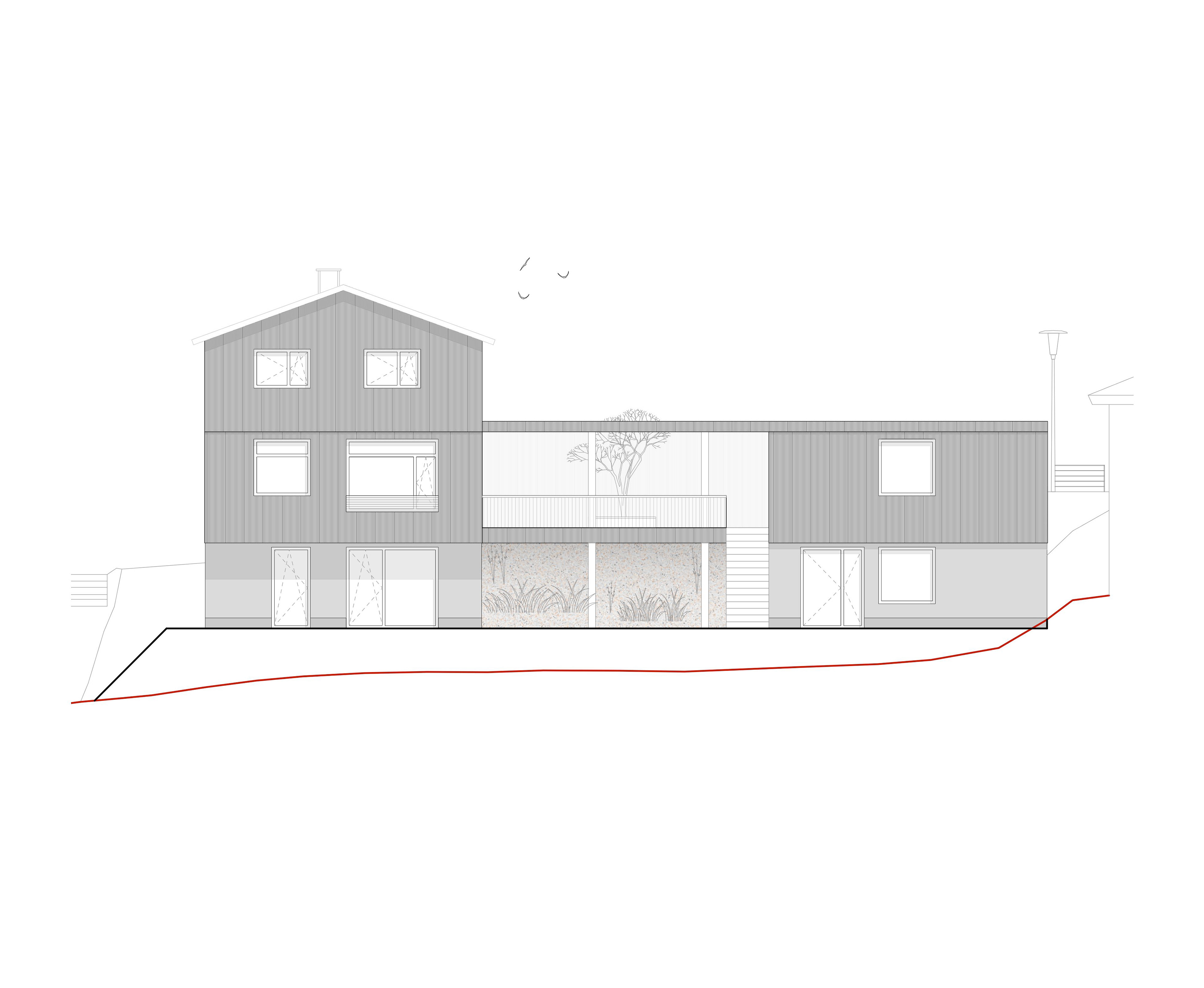 Das Haus entwickelt sich über drei Ebenen: Das untere Hanggeschoss öffnet sich großzügig zum Garten hin und schafft somit einen direkten Außenbezug. Das darüberliegende Erdgeschoss organisiert das alltägliche Wohnen und bindet durch eine aufgeständerte Terrasse die Doppelgarage mit ein – auf diese Weise entsteht ein geschützter Außenraum zwischen den beiden Baukörpern. Im Obergeschoss befinden sich die privaten Rückzugsräume der Familie.