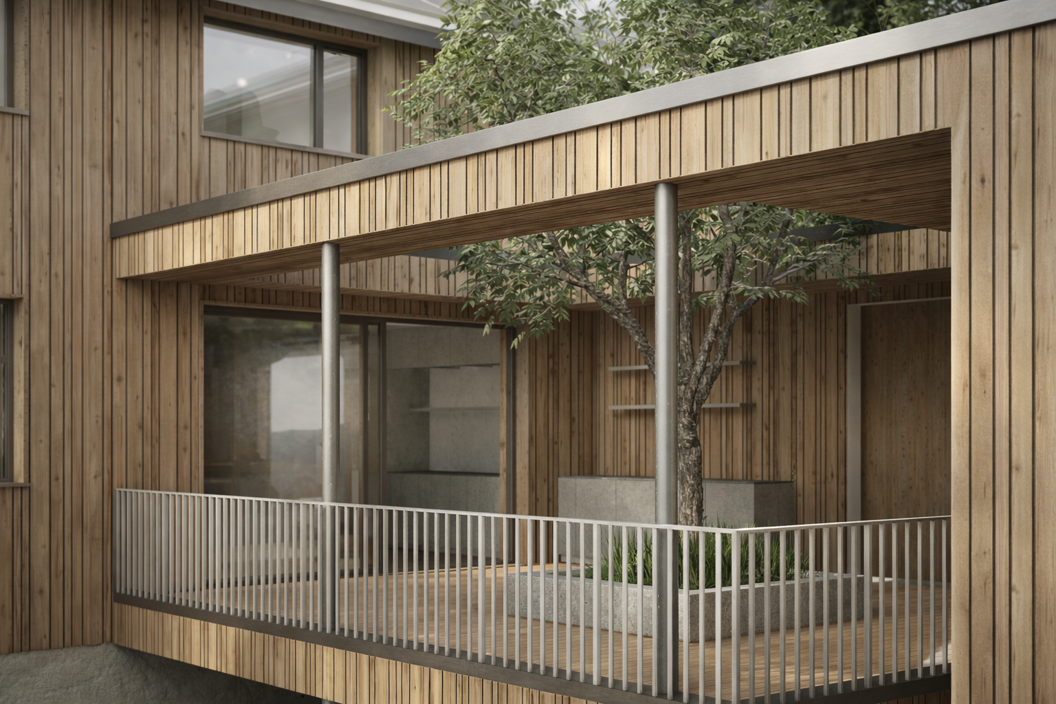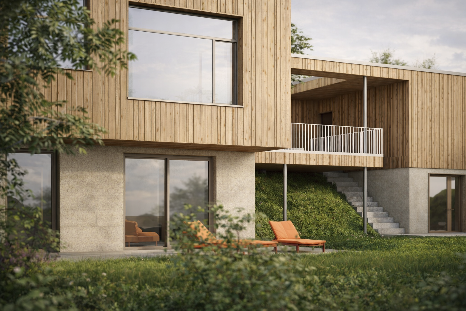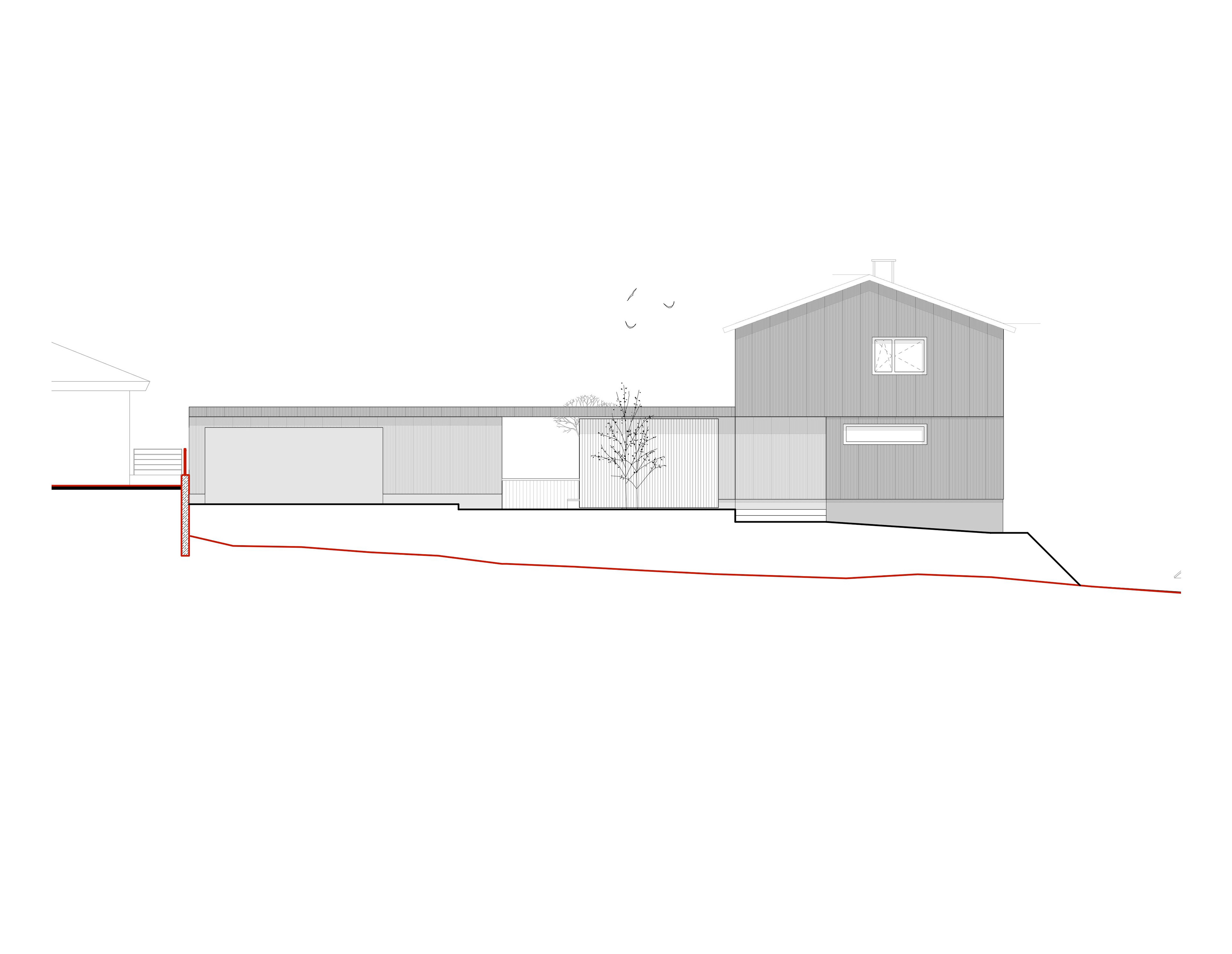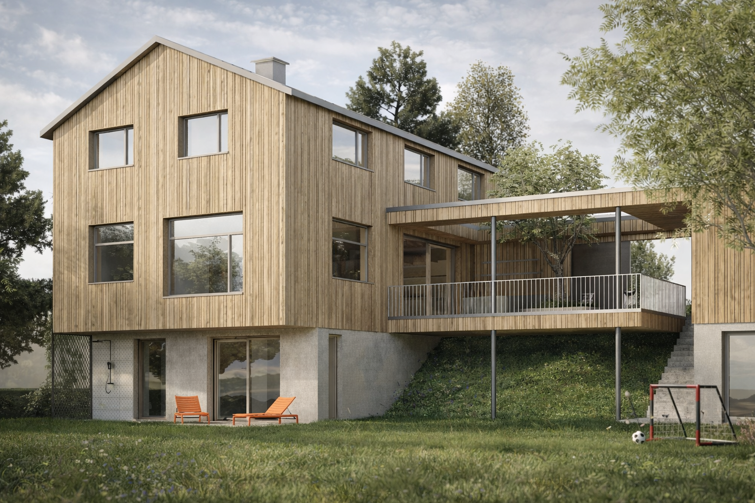 Das Haus entwickelt sich über drei Ebenen: Das untere Hanggeschoss öffnet sich großzügig zum Garten hin und schafft somit einen direkten Außenbezug. Das darüberliegende Erdgeschoss organisiert das alltägliche Wohnen und bindet durch eine aufgeständerte Terrasse die Doppelgarage mit ein – auf diese Weise entsteht ein geschützter Außenraum zwischen den beiden Baukörpern. Im Obergeschoss befinden sich die privaten Rückzugsräume der Familie.