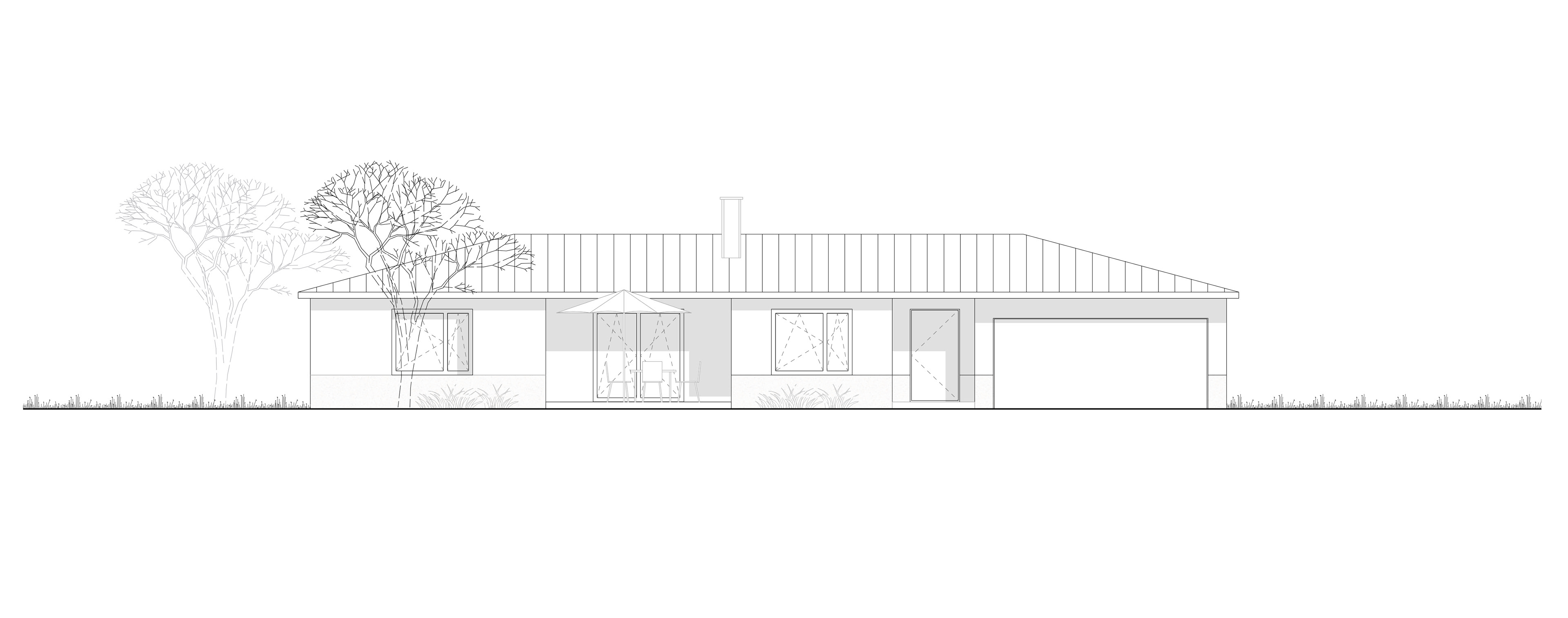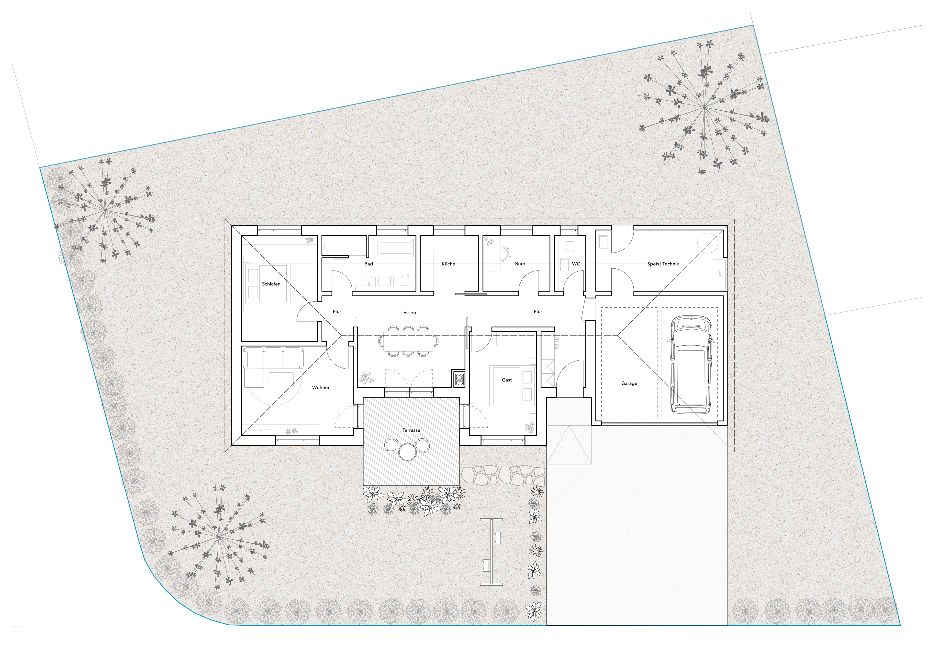 Der Baukörper vereint das Wohnhaus und die Doppelgarage unter einem Dach und gibt sich nach Außen mit Zurückhaltung und Klarheit. Alle Räume orientieren sich in ihrer Organisation an den Prinzipien der Übersichtlichkeit, kurzen Wege und einer klaren Struktur.
