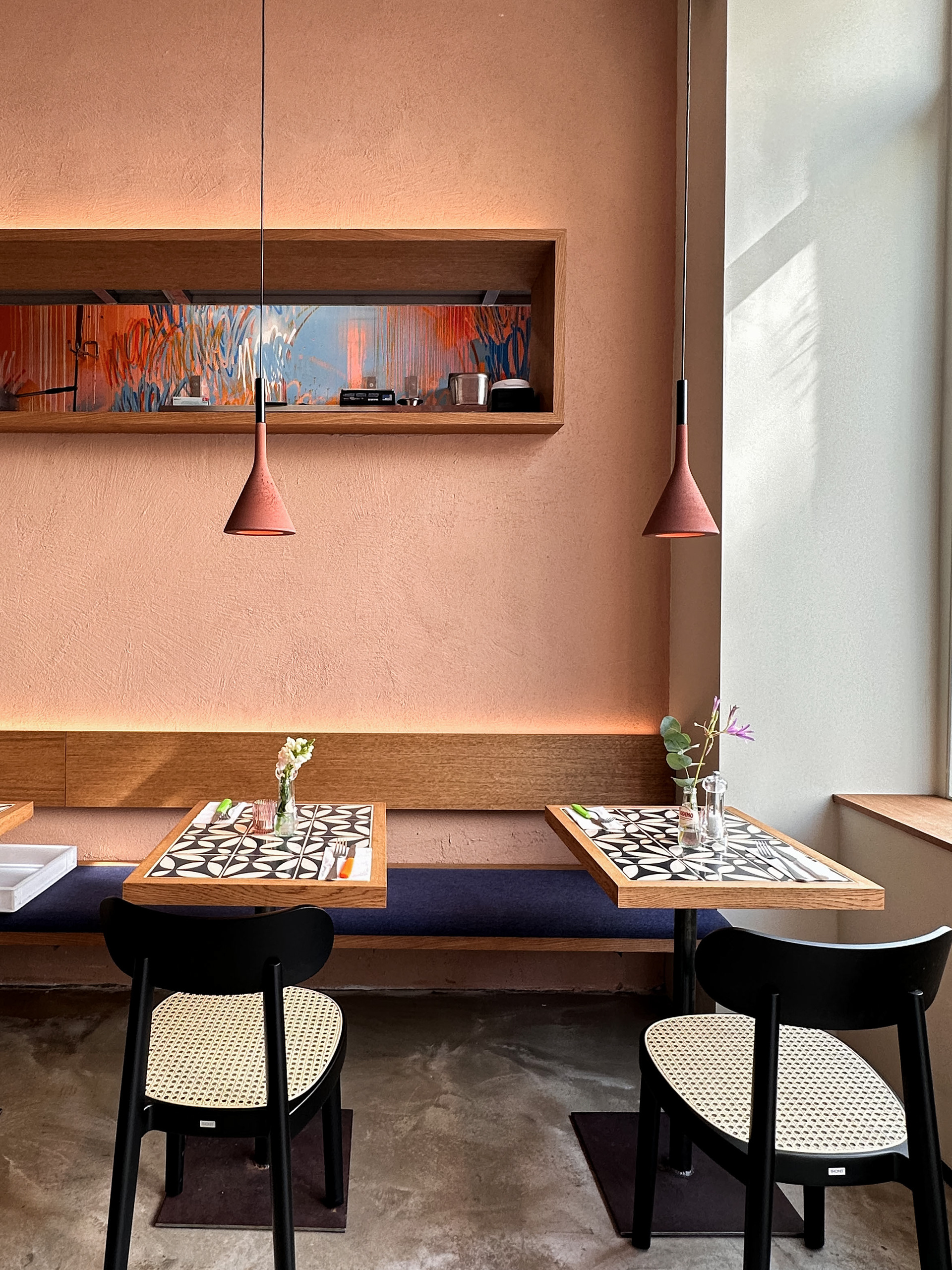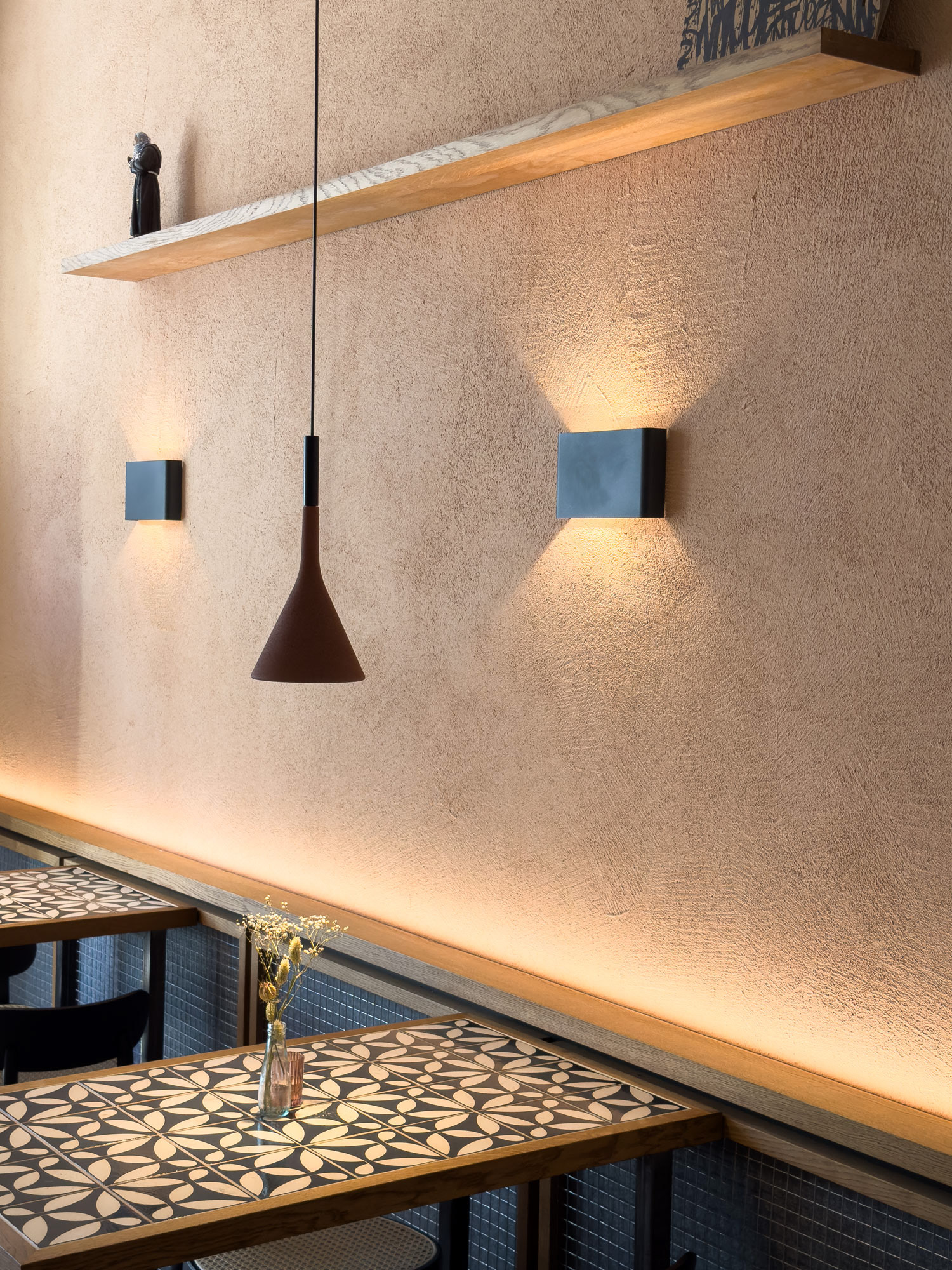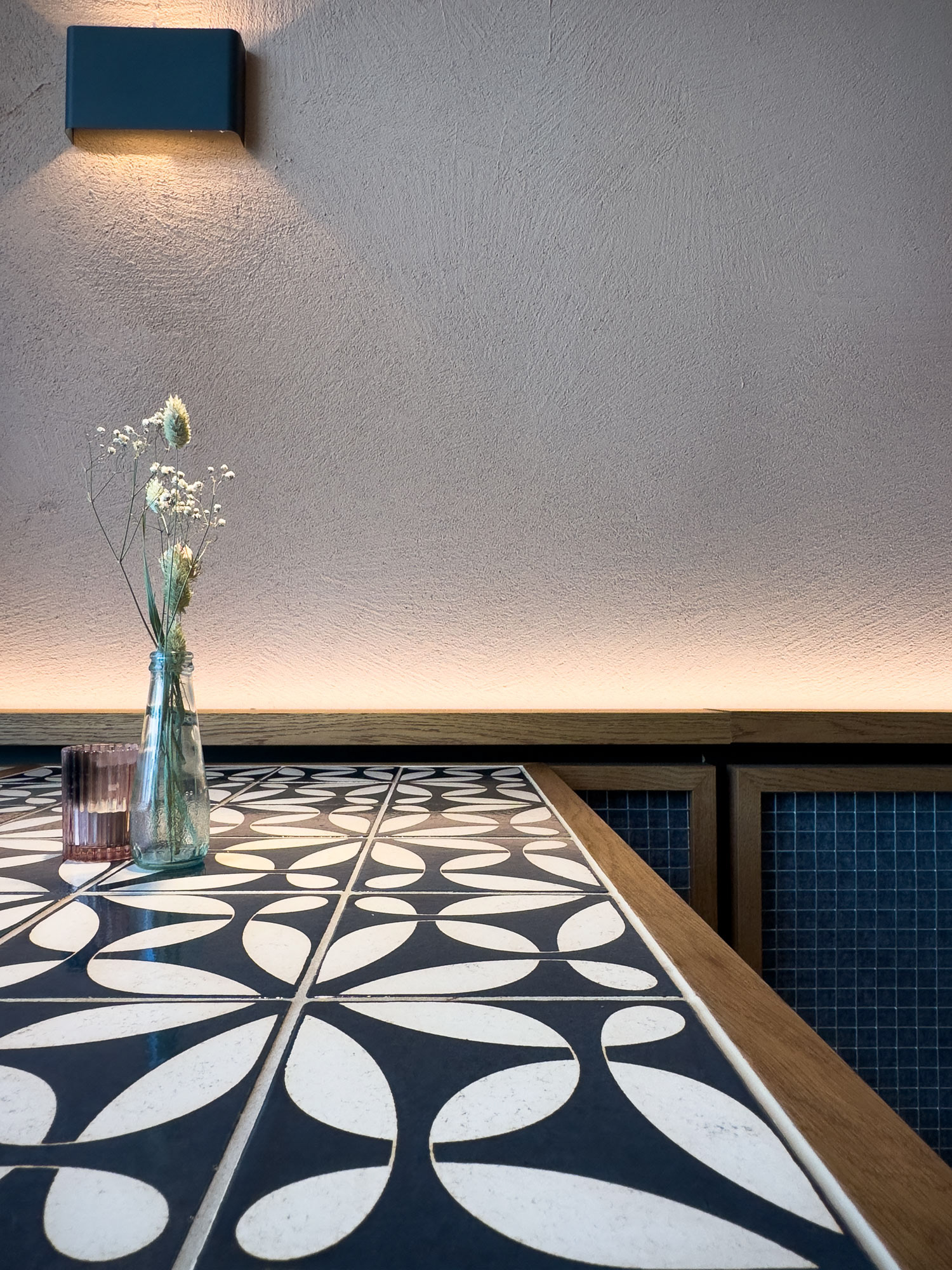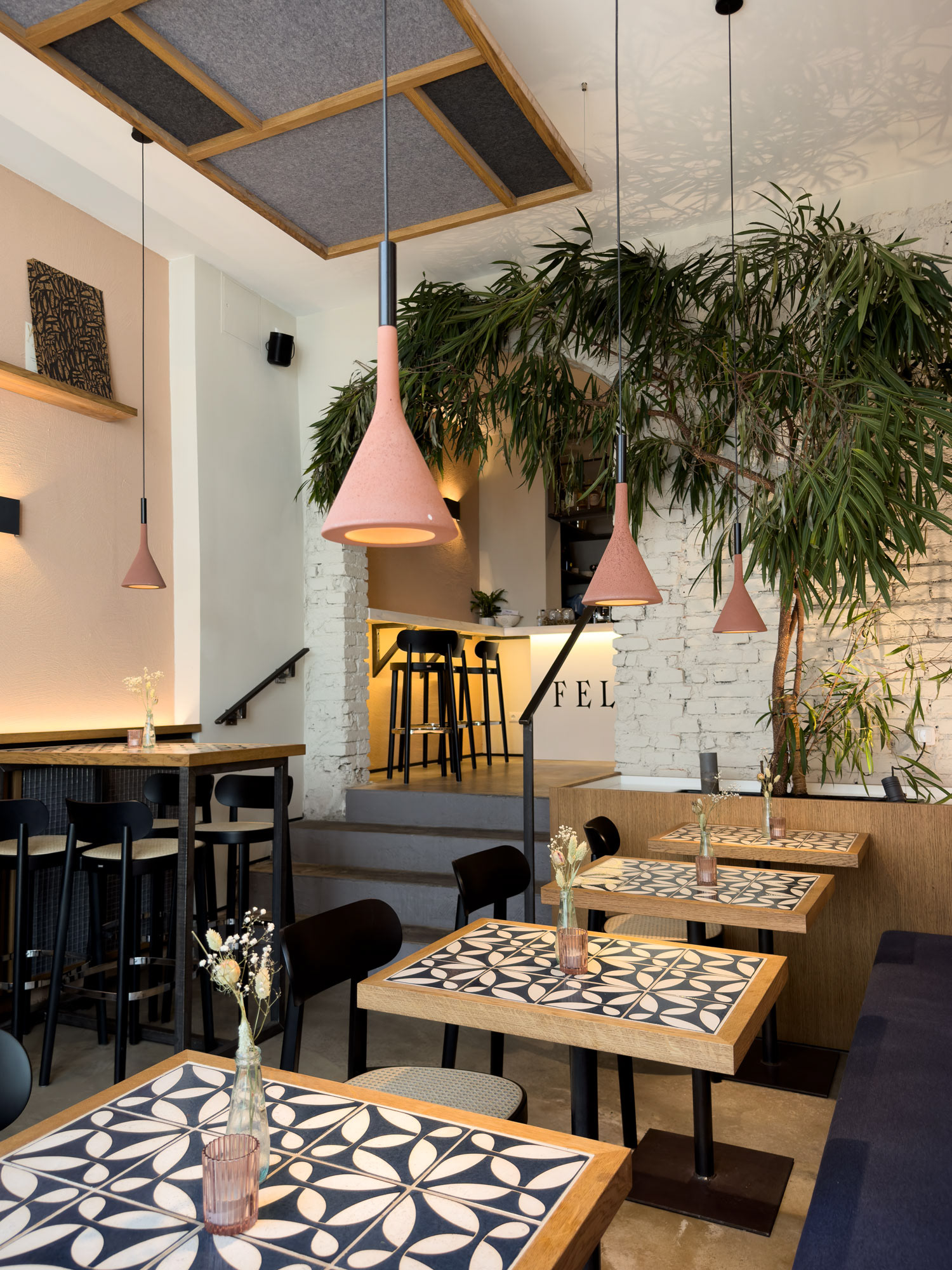 Auch das Lichtkonzept wurde bewusst gewählt: Die Pendelleuchten setzen gezielte Akzente, verleihen dem Raum eine besondere Stimmung und rücken die Karak-Fliesen auf den Tischen wirkungsvoll in Szene.