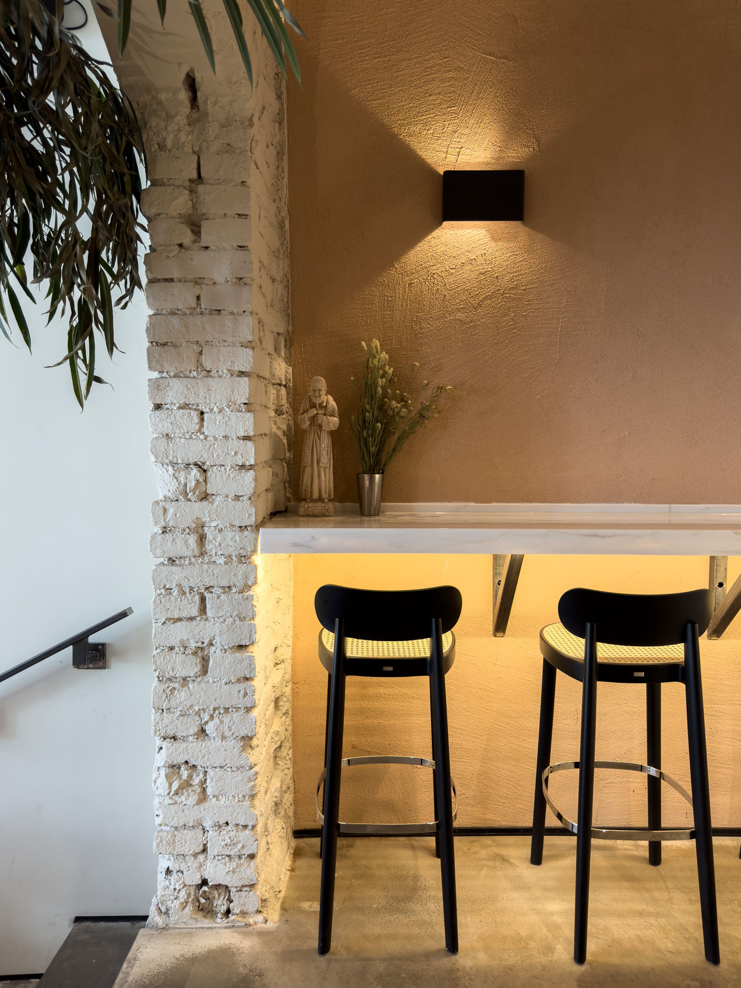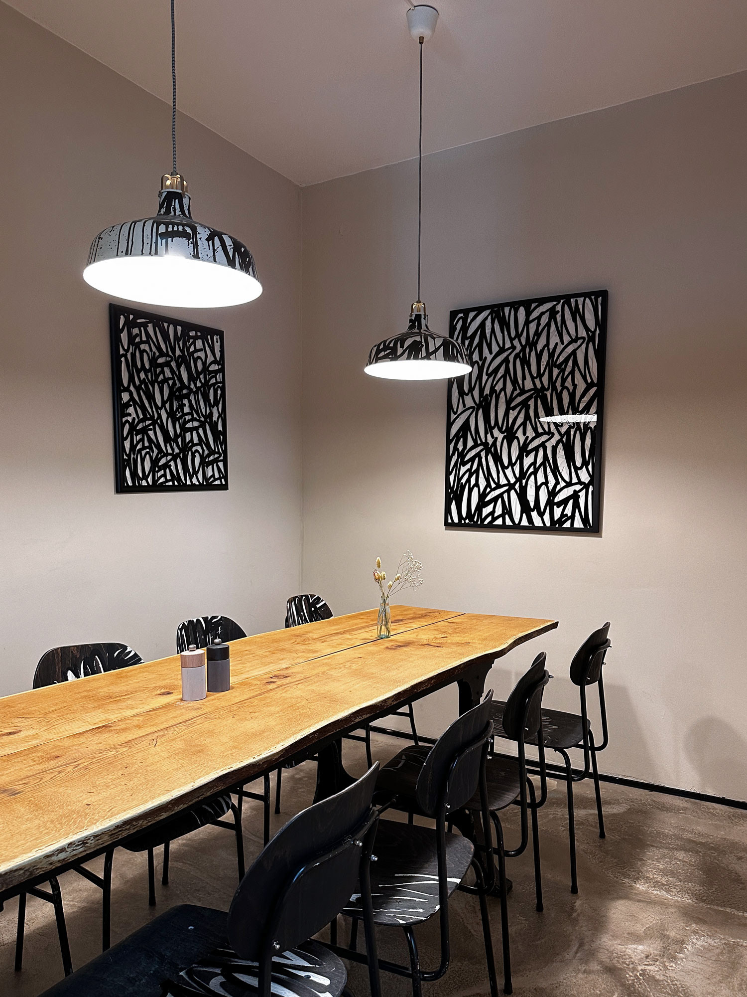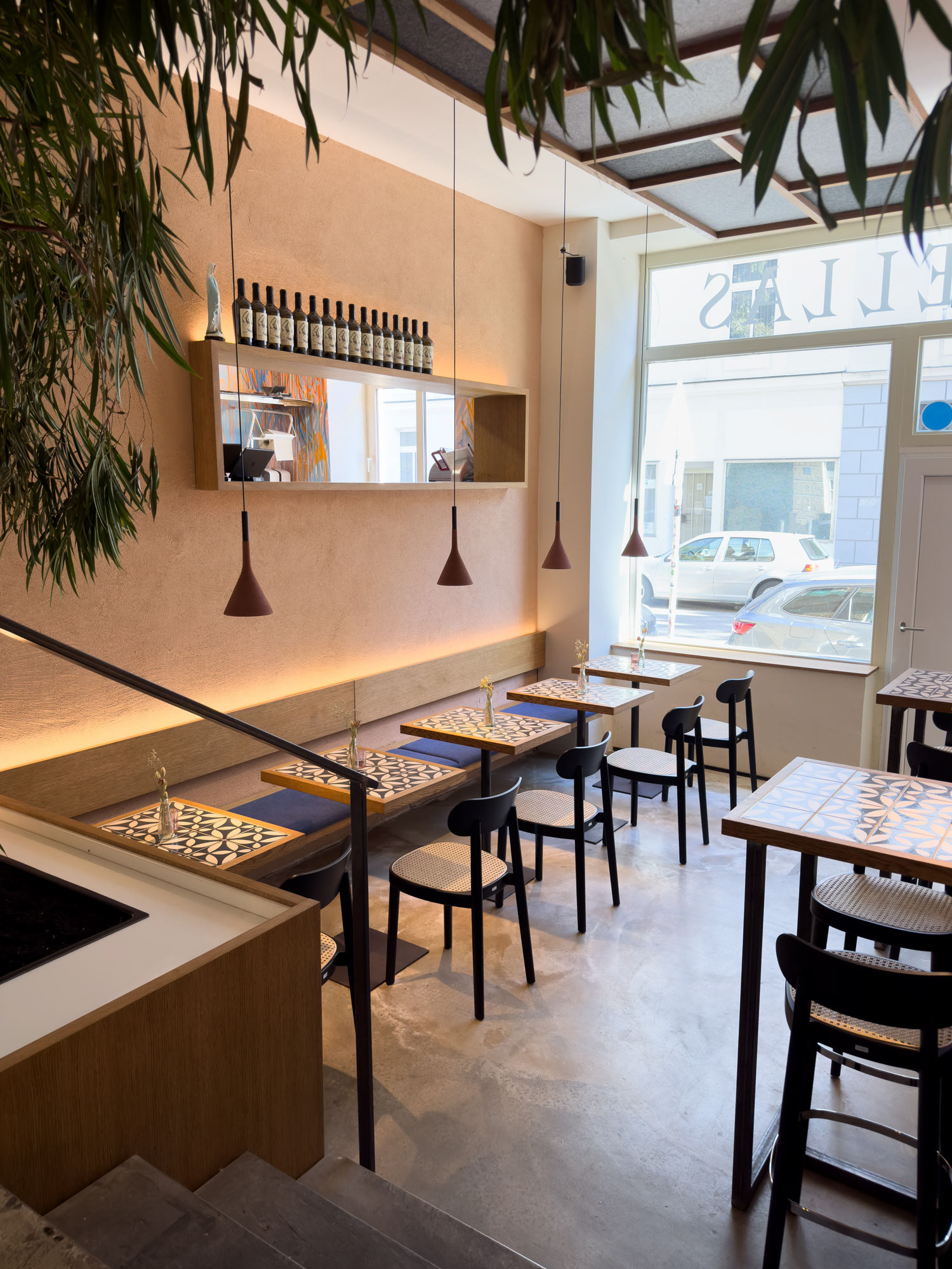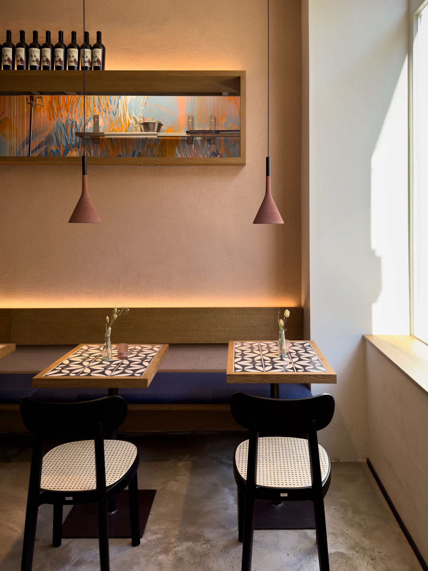 Auch das Lichtkonzept wurde bewusst gewählt: Die Pendelleuchten setzen gezielte Akzente, verleihen dem Raum eine besondere Stimmung und rücken die Karak-Fliesen auf den Tischen wirkungsvoll in Szene.