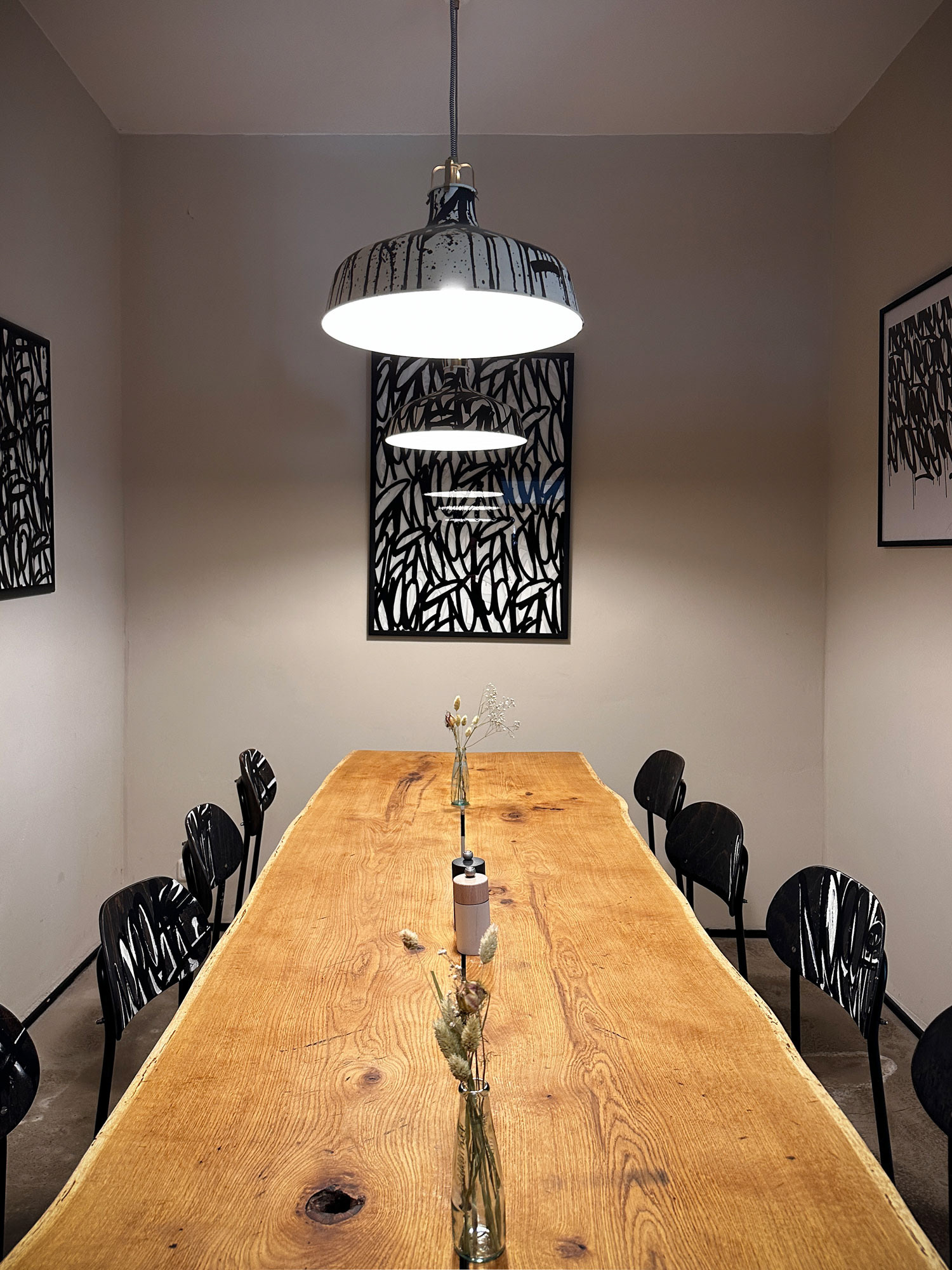 Ein zentrales Element unseres Gestaltungskonzepts war die individuelle Ausführung der Tische. Die Tischplatten wurden aus maßgefertigten Eichenholzrahmen gefertigt, die nicht nur durch ihre Langlebigkeit überzeugen, sondern zugleich eine warme, rustikale Eleganz ausstrahlen. Das besondere Highlight bildet jedoch die Integration der Fliesen in die Holzrahmen.