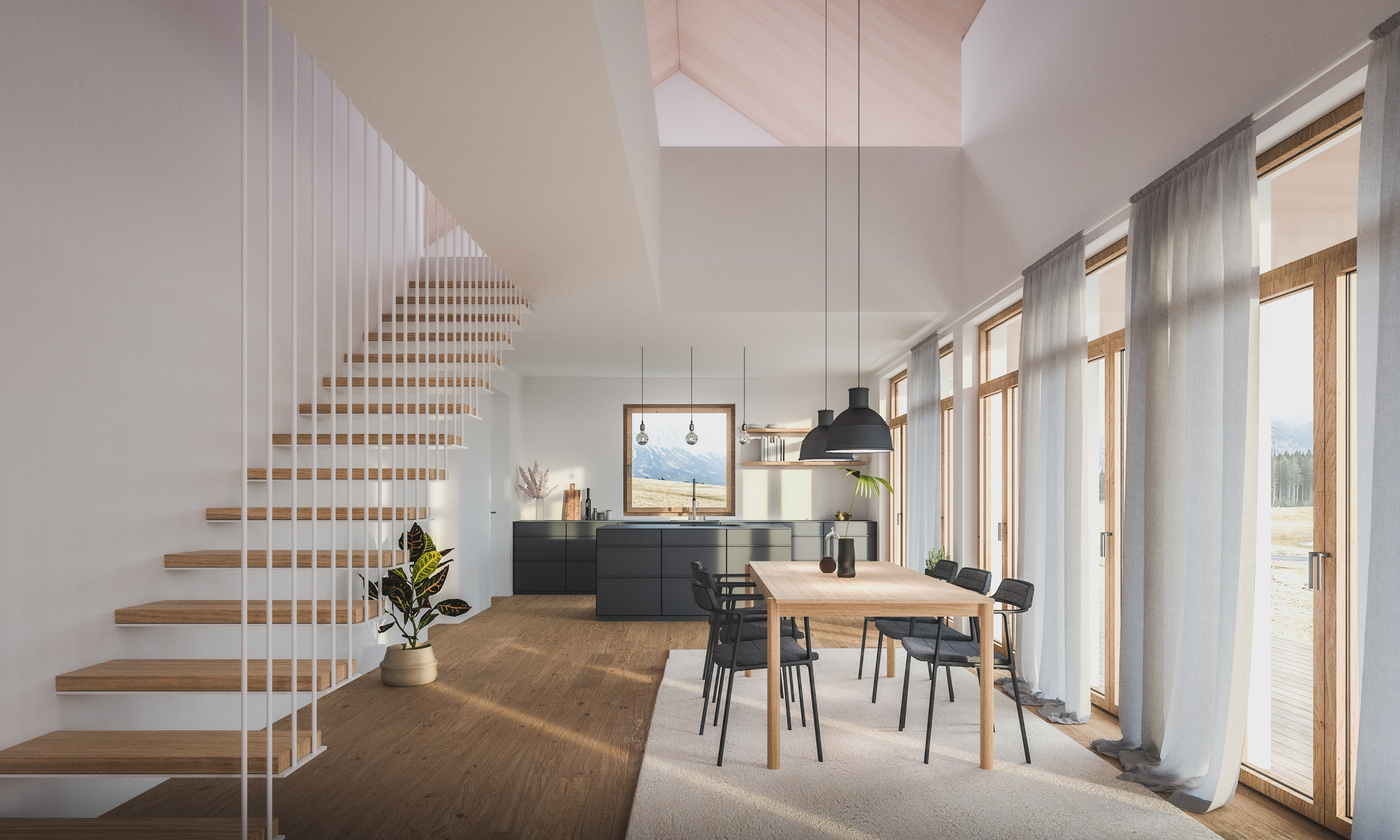 Das Projekt umfasst ein Wohnhaus und einer separaten Wohneinheit, die unter einem Dach vereint sind. Beide Wohneinheiten werden an der nordwestlichen Gebäudeecke erschlossen, was eine optimale Nutzung des Grundstücks ermöglicht. Besonderes Augenmerk liegt auf dem fließenden Übergang zwischen Innen- und Außenbereich. Der Garten wird dabei in den Innenraum integriert, um eine harmonische Verbindung von Natur und Wohnraum zu schaffen. Durch großzügige Fensterflächen und offene Grundrisse wird der Außenbereich visuell erweitert, sodass die Bewohner das Gefühl haben, ständig mit der Natur verbunden zu sein.